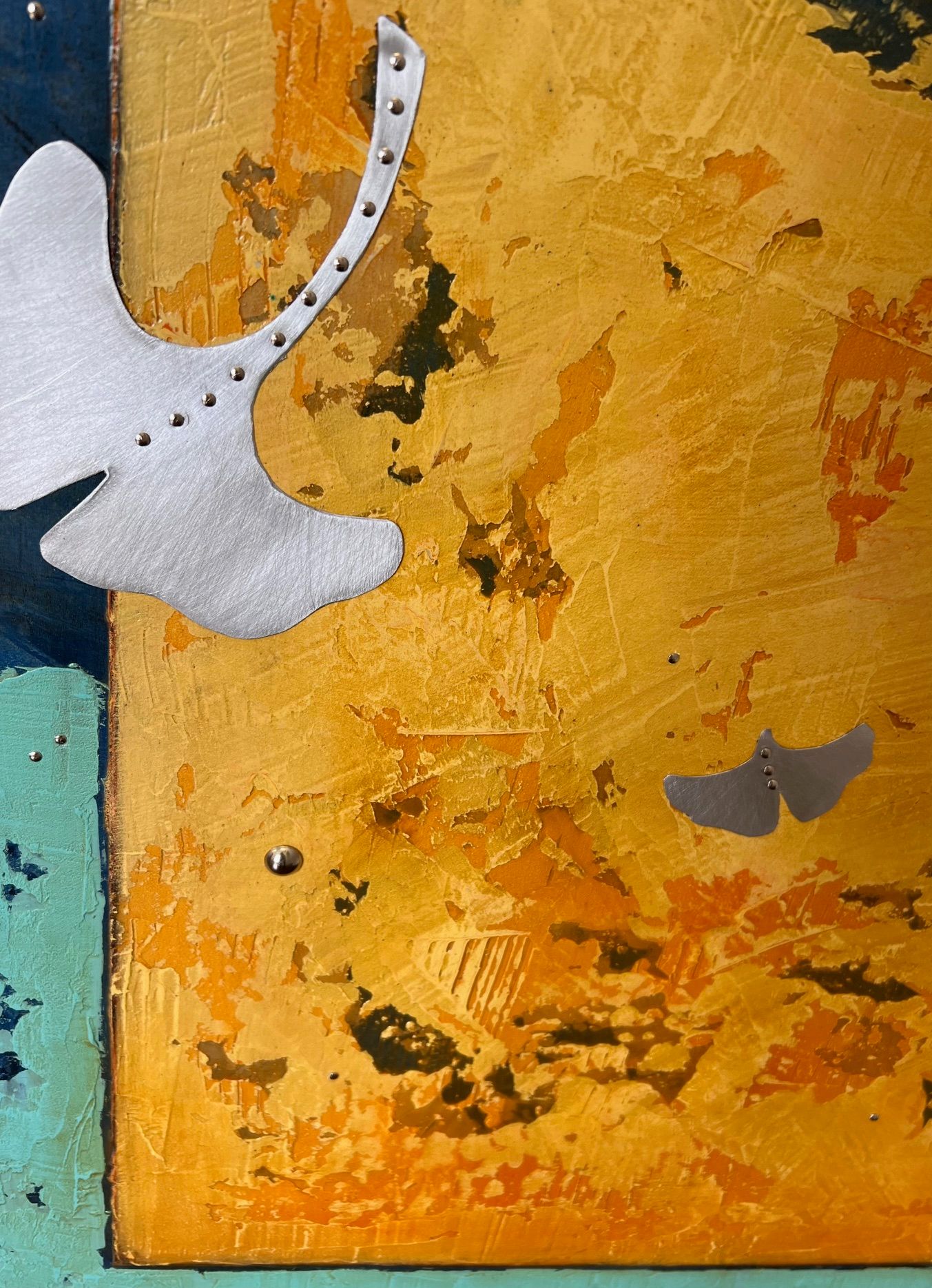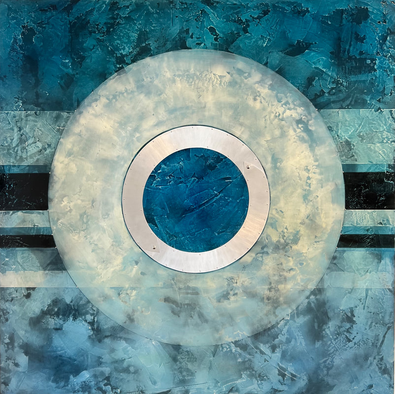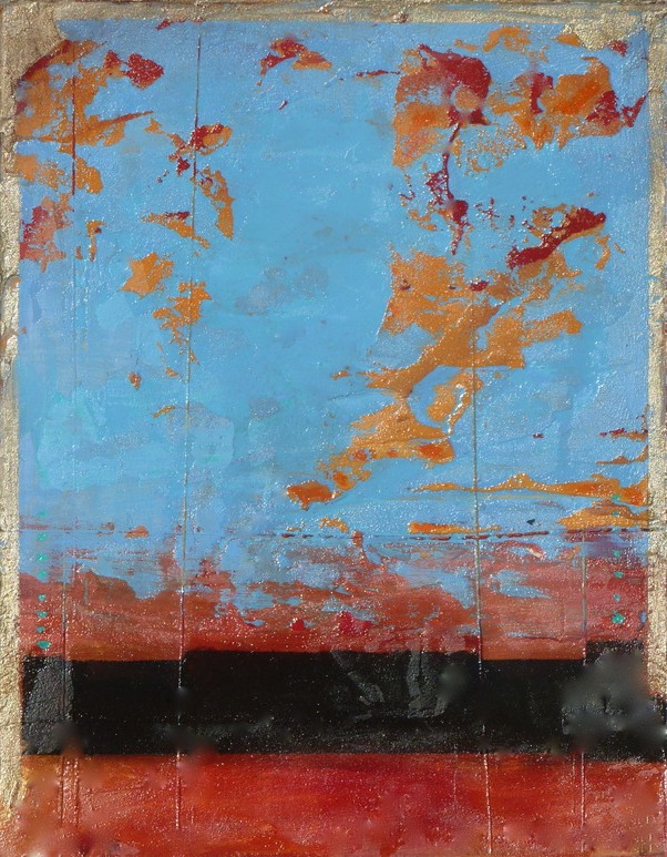 She combines classical oil glaze techniques, using natural dry mineral pigments, over marble dust, with contemporary brushed metal on wood and/or paper.
