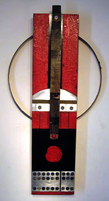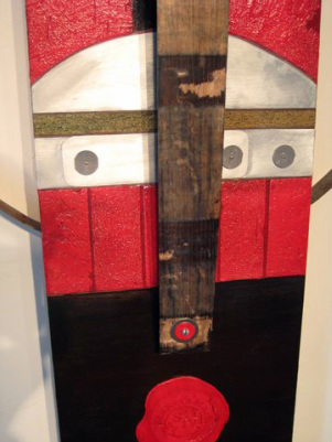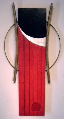 After some fun field trips with artists wandering around looking, seeing very different things, I choose to make two abstract pieces representing some architectural lines that spoke to me… a curve next to one of the huge vats, the ribbed floor, the metal studs in the copper boilers and more, incorporating the signature red and actual smoked wood and metal from old barrels… a very potent smell in my studio while working on these.