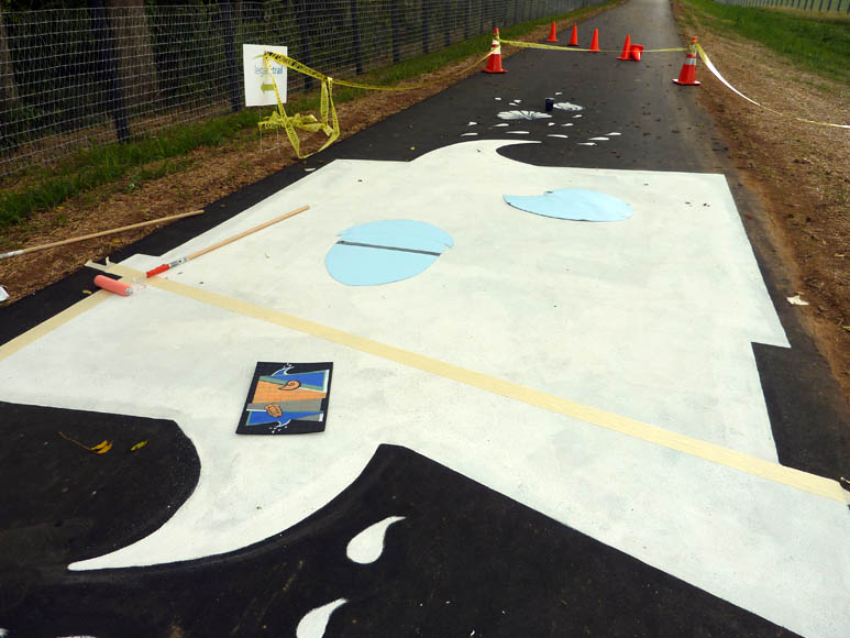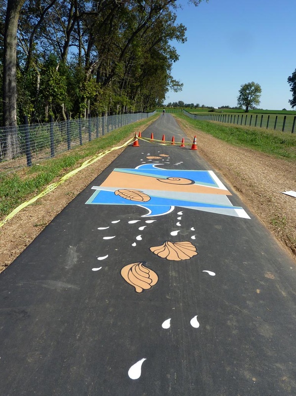 Presently 9 miles are completed and 3 more will be built. 10 artists have painted tapis on the black top, and 15 artists have created blazes (tall flags) all with a narrative about Kentucky.