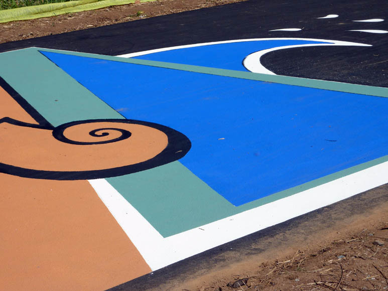 Steene’s piece represents the creation of the landscape/limestone, and she choose to depict, in simple forms, the shallow tropical sea it once was, and the fossils that are commonly found in the in the Kentucky limestone. The tapis is approx 125 square feet, using Street Bond paint”, titled Once It Was the Sea.