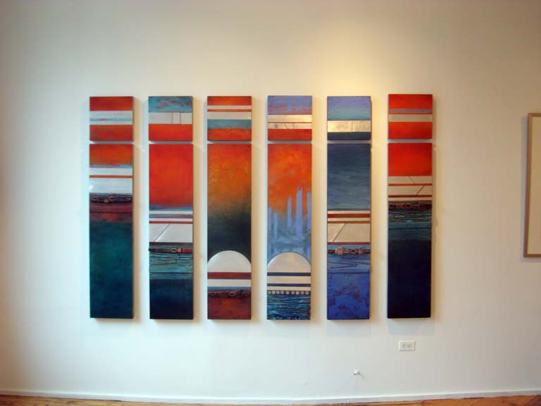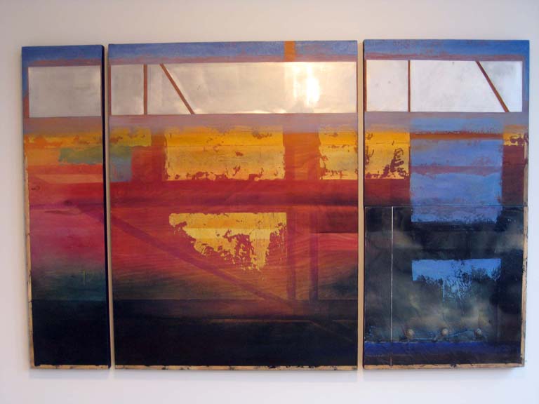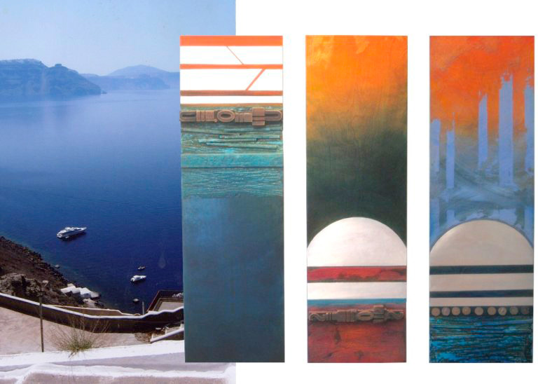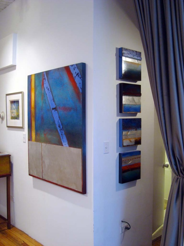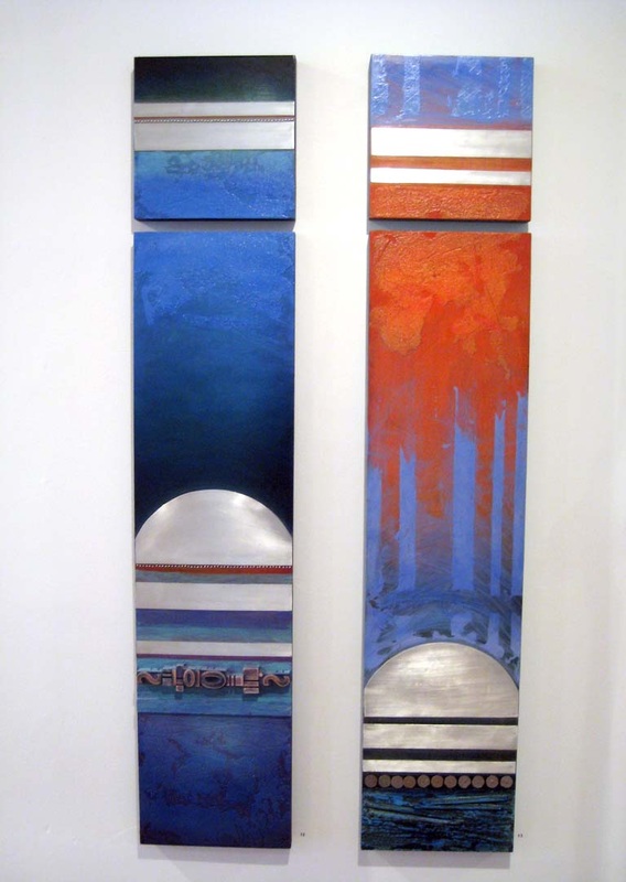 The paintings and collages in this show are created with textures and layers of information built up through additions and subtractions, incorporating marble dust, sand, metal, acrylic and numerous translucent layers of oil. The surfaces of weathered wood works, and the gentle softness of yearly repainted houses, intrigue me, as well as the constantly varying blues of the water, the magnificent sunsets, and the brilliant colors of the fauna, which all contribute to my choices of colors.